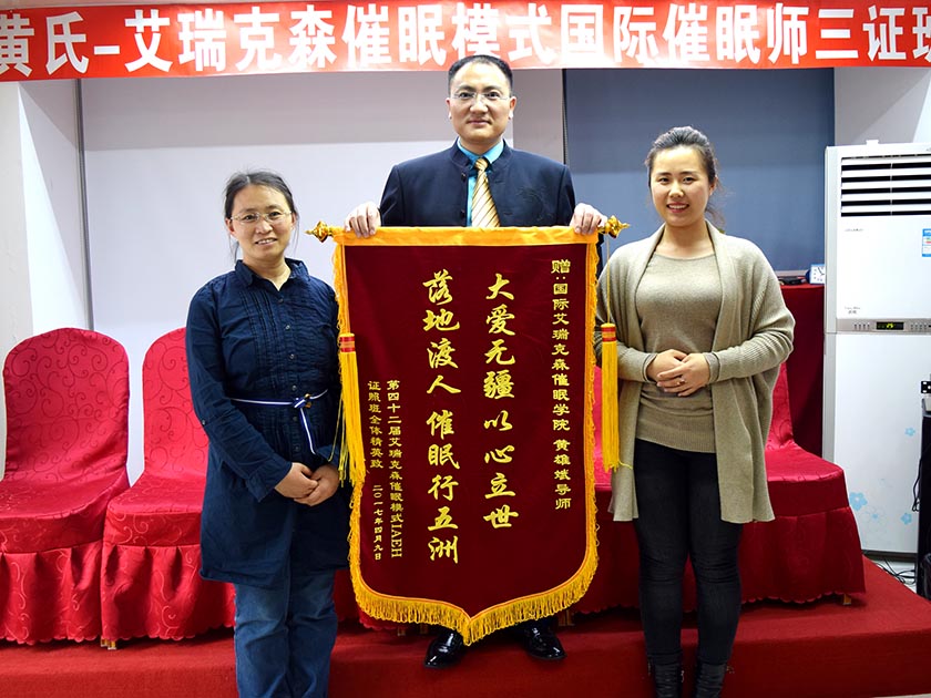 江苏杨女士,乃是清华大学的博士后毕业的超级学霸,也是江苏一所大学的教授;为了帮助她老公打造青少年教育项目,她受托前来学习催眠与NLP技术。于是,她于2013年12月27日--2014年1月3日参加了我们的《黄氏-艾瑞克森催眠模式国际三证班》。经过8天6夜的“黄氏-艾瑞克森催眠训练”,她的内心压抑的负面能量被一扫而空,心理能量大幅度提升!同时,她也掌握了这套强大的“黄氏-艾瑞克森催眠秘诀”,融合到她老公的青少年教育项目中,有效地帮助孩子们激发了潜能,改造了不良习惯,打造了高超的情商与心理素质!