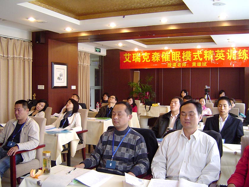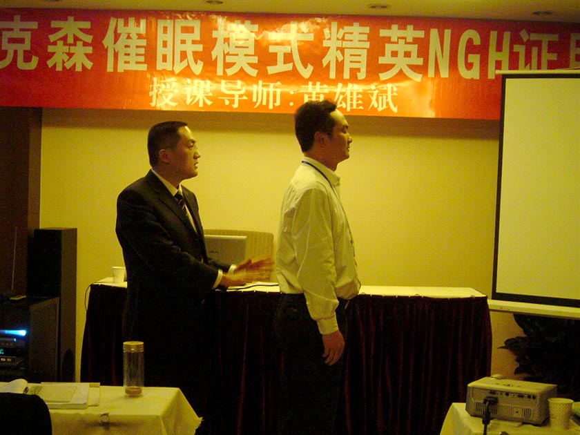 经过8天的训练(2008年4月5日——4月12日),第05届“黄氏-艾瑞克森催眠模式NGH证照班”圆满成功。参加本届催眠班的精英,有来自上海、浙江的,也有来自重庆、山东、山西、河北的,还有来自遥远的新疆、辽宁、广东、广西的,甚至还有来自遥远的美国的;有想要疗愈心理疾病与障碍的,也有想提升催眠技术,成为专业催眠治疗师的;有完全没有接触过催眠的,也有学过其他催眠课程的;有心理学硕士、国家心理咨询师,也有企业总裁和高管;有职业培训师,也有国家公务员。大家带着不同的目标而来,最终都满载而归!