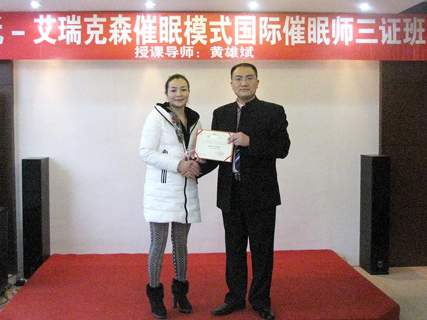 浙江叶女士,一家美容店老板,童年时期的心理阴影,导致她产生了严重的性格缺陷,内心抑郁,缺乏安全感;前一段婚姻失败,让她几乎到了崩溃的边缘!为了改变这种痛苦的局面,她于2011年12月27日--1月3日参加了我们的《黄氏-艾瑞克森催眠模式国际三证班》。经过8天6夜的“黄氏-艾瑞克森催眠训练”,她的人生发生了脱胎换骨的蜕变;经过催眠课堂现场的多次实战催眠治疗体验,她内心压抑多年的负面能量被一扫而空,化解了压抑多年的心理创伤,心理能量大幅度提升;扭曲的家庭系统也得以归位,重建了家庭系统的爱与链接,激活了灵魂深处的爱的能量,身心灵也回归了和谐与安宁,整个人变得自信快乐,满载而归!