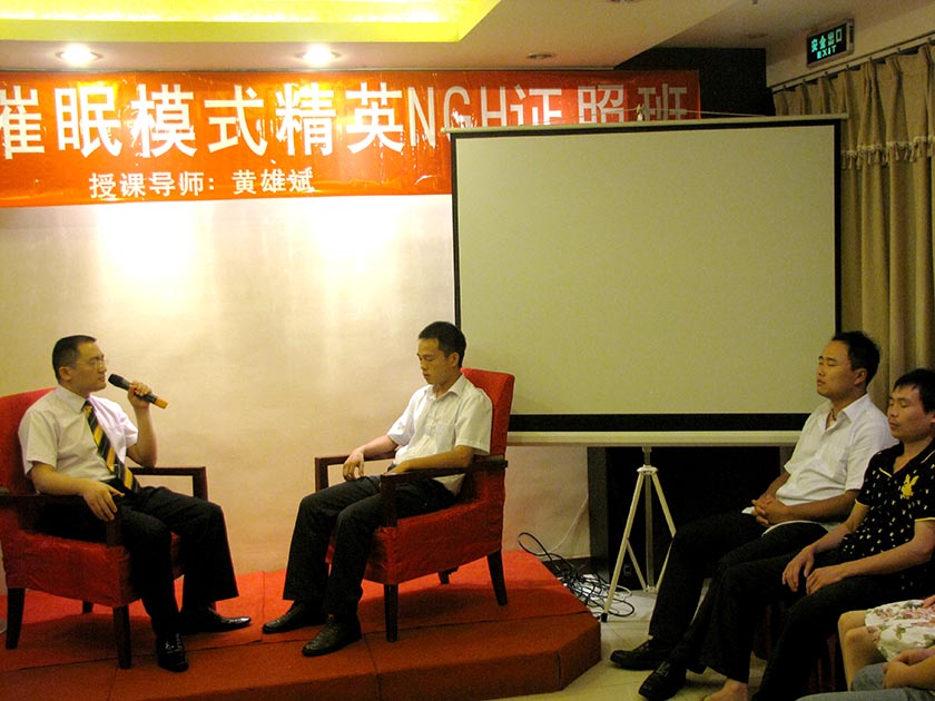 湖北熊先生,是广东一家工厂的模具工人,原生家庭的教育缺陷,导致他内心产生了严重的心理疾病,形成了社交恐惧、深度自卑、强迫焦虑等症状;处在极度压抑和焦虑的状态,随时准备战斗,身体随时像钢板一样硬!为了改变这种痛苦的局面,他于2010年7月6日--7月13日参加了我们的《黄氏-艾瑞克森催眠模式国际三证班》。经过8天6夜的“黄氏-艾瑞克森催眠训练”,经过课堂现场的多次实战催眠治疗体验,他内心压抑多年的负面能量被一扫而空,战胜了内心压抑多年的社交恐惧,身心灵回归了和谐与安宁,整个人终于松弛了,脱胎换骨!