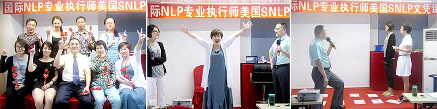 经过8天6夜的训练(2015年8月16日——2015年8月23日),第09届“国际NLP专业执行师美国SNLP证照班”圆满成功。本次课程帮助同学们开启了一道全新的认知世界、掌控思维和行为的大门。经过8天6夜的系统NLP训练,同学们已经发生了脱胎换骨的蜕变,都已成为了身心灵平衡的精英;经过一段时间的磨炼后,同学们都会成精通NLP技术的心灵专家、沟通高手、人性高手;真正远离痛苦、获得快乐,达成人生目标、实现人生理想!